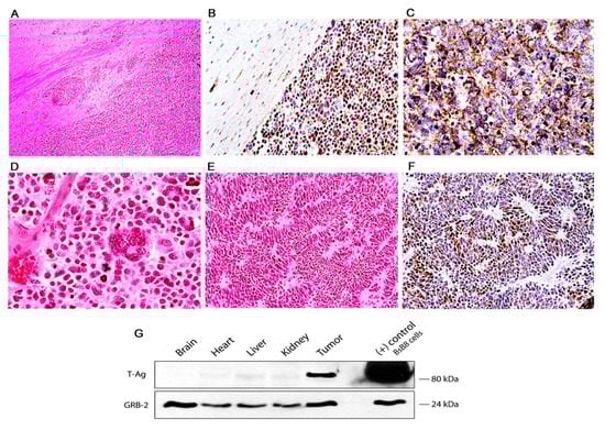 Primitive neuroectodermal tumors in JCV transgenic mice; histological and immunohistochemical characterization. The tumors are composed of sheaths of numerous small and densely packed cells, which diffusely infiltrate the brain parenchyma (Panel (A), hematoxylin and eosin, original magnification ×100). Immunohistochemistry for JCPyV T-antigen highlights the presence of the primitive neoplastic cells (Panel (B) original magnification ×100). Immunohistochemistry for Class III β-tubulin reveals the early neural origin of the tumors (Panel (C), original magnification ×200). At higher magnification the slightly elongated nuclei and scanted cytoplasm of the cells can be appreciated. Numerous mitotic figures and apoptotic bodies are present as well as giant multinucleated cells (Panel (D), hematoxylin and eosin, original magnification ×400). The neoplastic cells frequently arrange in a circular, concentric pattern, which resembles Homer-Wright rosette formation. Neoplastic cells in these rosette formations express T-Antigen (Panels (E) and (F), H&E and T-Antigen respectively, original magnification ×100). (G) Western blot from protein extracts of different organs of the transgenic mice, probed with T-Antigen demonstrates the presence of the oncoprotein in the tumor (Medulloblastoma), but its absence in all organs, including the normal brain adjacent to the tumor.