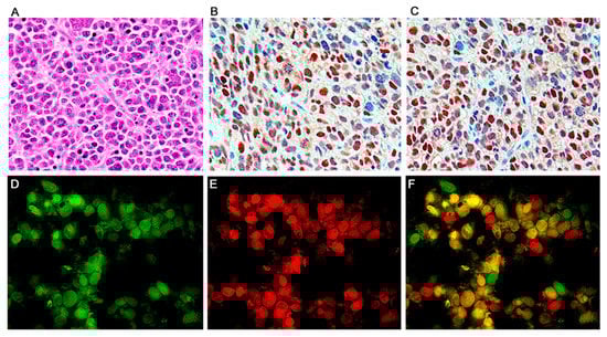 Primitive neuroectodermal tumors; T-Antigen and cell cycle proteins. High magnification view of a PNET, formed by sheaths of numerous small basophilic cells, where mitotic figures and apoptosis bodies can be seen (Panel (A), hematoxylin and eosin, original magnification ×600). Immunohistochemistry for T-Antigen demonstrates the nuclear localization of the protein in approximately 75–80% of the neoplastic cells. (Panel (B)). p53 expression was robustly found in the nuclei of approximately the same number of neoplastic cells in all PNETs (Panel (C)). Immunofluorescence with a fluorescein tagged antibody for T-Antigen reveals robust nuclear signal in neoplastic cells (Panel (D)); p53, tagged with rhodamine is also expressed in the nuclei of the primitive neoplastic cells (Panel (E)). Double labeling, utilizing a deconvolution microscope reveals the co-localization of both proteins in the nuclear compartment (Panel (F), all panels original magnification ×1000).