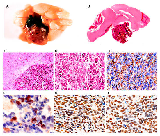 Primitive Neuroectodermal Tumors (PNETs). This phenotype was by far the most frequently observed in the archetype strain transgenic animals. 178 developed PNETs, all of them between 2 and 6 months after birth. The tumors ranged in size from microscopic foci of few neoplastic cells (Figure 2A,B), to giant masses that substitute close to 80% of the brain parenchyma (Figure 2C). The tumors originated in different locations of the central nervous system. The most frequent location observed has been the lower part of the brainstem and upper portion of the cervical spinal cord with 69 animals developing tumors in this place (Figure 2D–H), followed by the basal ganglia with 52 (Figure 2J,K), the cerebral hemispheres, especially the frontal and parietal cortices with 34. Tumors arising from the cerebellum, which were classified as medulloblastomas accounted for 8. Tumors in the spinal cord appeared in 7 animals, and more rarely the tumors arise from the hippocampus (4), and the olfactory bulb also with 4 cases (Figure 2I). Macroscopically, the tumors appear as poorly circumscribed, infiltrating masses, of solid consistency and gray color, with no discernable areas of necrosis or hemorrhage, and very similar in appearance to medulloblastomas in humans. Table 2 below shows the location of these embryonal tumors.