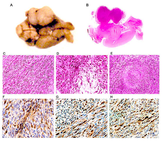 Malignant peripheral nerve sheath tumors (MPNSTs); histological and immunohistochemical characterization. Ventral surface of a transgenic mouse brain showing a large, well-circumscribed, solid, homogeneous mass located in the ponto-cerebellar angle (Panel (A)). A full montage demonstrates that the tumor is extra-axial and located in the place of the vestibulocochlear nerve (Panel (B)). Histologically, tumors are composed of numerous, tightly packed, spindle cells, which form interlacing bundles and fascicles. A large number of mitotic figures are present (Panel (C)). Dense cellularity areas (Antoni type A) alternate with areas where cells are loosely distributed (Antoni type B) (Panel (D)). Also present are cellular whirling areas, which correspond to Verocay bodies (Panel (E)). Immunohistochemistry for S-100 protein shows intense reactivity in the cytoplasm of neoplastic cells (Panel (F)). T-Antigen (Panel (G)), and p53 (Panel (H)) are expressed in the nuclei of neoplastic cell throughout the tumors. (Panels (B)–(E), hematoxylin & eosin all panels original magnification ×400).