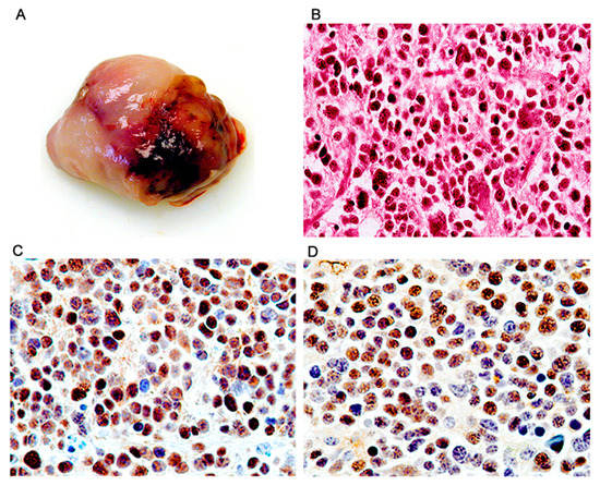 Adrenal neuroblastomas; histological and immunohistochemical characterization. Tumors originated in the adrenal gland and were grossly solid, homogeneous mases (Panel A). Histologically the tumors were composed of sheets of round cells exhibiting nuclear pleomorphism and scant cytoplasm (Panel B, hematoxylin and eosin). By immunohistochemistry, the majority of neoplastic cells showed robust expression of T-Antigen (Panel C), and wild-type p53 (Panel D). (All panels original magnification ×400).