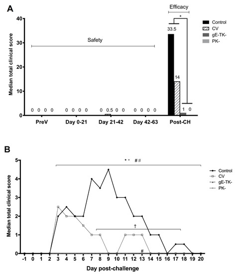Clinical scores. (A) Median total clinical scores of controls (black bars), commercial vaccine group (CV, dashed bars), gE-TK- vaccinated group (dark grey bars), and PK- vaccinated group (light grey bars). Median total scores pre-vaccination (pre-V), from day 0 to 21 (post-V1 for gE-TK- and PK-), from day 21 to 42 (post-V2 for gE-TK- and PK- and post-V1 for CV), from day 42 to 63 (post-V3 for gE-TK- and PK- and post-V2 for CV), and post-challenge (post-CH) from day 64 to day 83. An Asterisk represents a significant difference (p < 0.05); (B) Median total daily scores of controls are shown from one day before challenge to day 20 post-challenge infection. Black * and grey *, respectively, indicate a significant difference (p < 0.05) between the controls and the gE-TK- vaccinates and the PK- vaccinates. Black # and grey #, respectively, indicate a significant difference (p < 0.05) between the commercial vaccine group and the gE-TK- vaccinates and the PK- vaccinates. Black † indicates a significant difference (p < 0.05) between the commercial vaccine group and the controls.