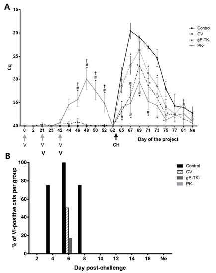 Viral nasal shedding: (A) Presence of FeHV-1 gB DNA quantitated by real-time PCR. Average viral shedding ±SEM (standard error of the mean) of controls (black circle and solid lines), commercial vaccine group (CV, open squares and dotted lines), gE-TK- group (triangles with dashed lines), and PK- group (diamonds with grey lines). * represents a significant difference (p < 0.05) from the control group. # represents a significant difference (p < 0.05) from the commercial vaccine group. † represents a significant difference (p < 0.05) between PK- and gE-TK- groups. Vaccinations in the gE-TK- and PK- groups on days 0, 21, and 42 are indicated by grey arrows and “V”. Vaccinations in the CV group on days 21, and 42 are indicated by a black bolded “V”. The challenge infection on day 63 is indicated by a black arrow and “CH”; (B) Virus isolation following challenge infection. The percentages of cats that were positive by virus isolation are indicated by black bars (controls), dashed bars (commercial vaccine group, CV), dark grey bars (gE-TK- group), and light grey bars (PK- group) daily post-CH.