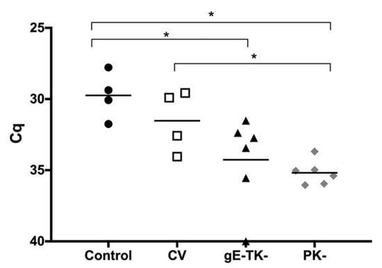 The results of viral quantification assays performed in trigeminal ganglionic samples are shown in Figure 3. The unvaccinated control group had a mean Ct value of 29.74, which was significantly lower than the value of 34.27 in the gE-TK- group (p = 0.05), or the value of 35.18 in the PK- group (p = 0.01) indicating higher levels of FeHV-1 gB DNA in the TG. There was no significant difference between controls and the commercial vaccine group (mean Ct value = 31.53). Further, Ct values in the commercial vaccine group were not significantly different from Ct values in the gE-TK- mutant group but were significantly lower than Ct-values in the PK- mutant group (p = 0.04). Finally, differences between gE-TK- and PK- groups were not significantly different and one cat was completely negative for FeHV-1 gB DNA, (Ct value = 40), in the gE-TK- group.