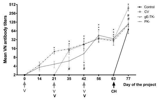 Average virus neutralization antibody titers ±SEM (standard error of the mean) of controls (black circle and solid lines), commercial vaccine group (CV, open squares and dotted lines), gE-TK- group (triangles with dashed lines), and PK- group (diamonds with grey lines). * represents a significant difference (p < 0.05) from the control group. # represents a significant difference from the commercial vaccine group. † represents a significant difference (p < 0.05) between the PK- and gE-TK- groups. Vaccinations of the gE-TK- and PK- group on day 0, 21, and 42 are highlighted by grey arrows (V). Vaccinations of the CV group are indicated by a black “V”. The challenge infection on day 63 is indicated by a black arrow and CH.