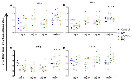 Interferon and CCL5 mRNA expression in whole blood samples: IFNα (A); IFNβ (B); IFNγ (C); CCL5 (D). The line is the median of CT values for each group corrected by a housekeeping gene (GAPDH) and individual symbols represent corrected CT values for individual cats. * represents a significant difference (p < 0.05) from the same group from day 0. CV: Commercial vaccine group. Time points of vaccinations were on days 0, 21 and 42 for the gE-TK- and PK- vaccinates and on days 21 and 42 for the commercial vaccine group.