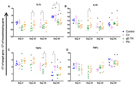 Cytokine mRNA expression in whole blood samples: IL1b (A); TNFα (B); TGFβ (C); IL10 (D). The line is the median of CT values for each group corrected by a housekeeping gene (GAPDH) and individual symbols represent corrected CT values for individual cats; * Represents a significant difference (p < 0.05) from the same group from day 0. † represents a significant difference (p < 0.05) between groups on the same sampling day. CV: Commercial vaccine group. Time points of vaccinations were on days 0, 21 and 42 for the gE-TK- and PK- vaccinates and on days 21 and 42 for the commercial vaccine group.