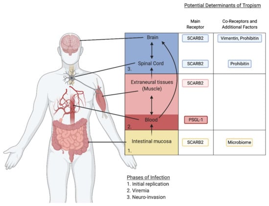 As respiratory or fecal–oral pathogens, EVs first enter into and replicate at their primary sites of infection in the respiratory or gastrointestinal tract. Neuro-invasion involves dissemination of the virus from these initial sites of infection to other tissues and organs including the CNS [36]. There are multiple routes by which EVs could gain access into the CNS. One possibility is the virus enters by crossing the blood–brain barrier (BBB), either by penetrating the barrier directly, infecting brain endothelial cells, or through a Trojan horse approach by infecting immune cells that can cross the barrier. Another possibility is that the virus gains access to the CNS by infecting peripheral nerves and invades the CNS via retrograde axonal transport. It is also possible that viruses may use a combination of these approaches to access the CNS. In all cases, the virus must first enter into an extraneural compartment, such as the blood or skeletal muscle, in order to reach a site of entry into the CNS. Once the virus has penetrated the CNS, infection of particular regions of the CNS results in the clinical symptoms associated with neuropathies. One of the determining factors of tissue susceptibility to viral infection is the availability of specific receptors on the surface of the host cell. EVs may utilize multiple receptors and attachment factors to promote their infection of different tissues and aid in their spread throughout the host. Elucidating what tissues are targeted by EVs and what receptors they use to disseminate into various tissues is critical to understanding their disease pathogenesis and may offer potential therapeutic targets for preventing spread to the CNS. Host determinants of neurotropism remain ill-defined to date, and additional research on host factors that contribute to viral susceptibility and the clinical symptoms of disease will lead to important insights into the prevention of neurological complications.