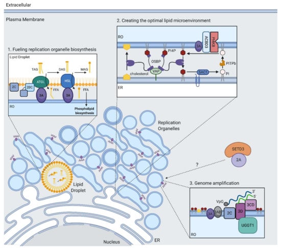 Cellular factors required for viral replication. (1) Genome replication takes place on virus induced membranous replication organelles (ROs). To establish the massive web of replication organelles during infection, EVs upregulate phospholipid biosynthesis. Upon infection, the import of free fatty acids (FFAs) and their storage in lipid droplets (LDs) is increased. FFAs serve as substrates for phospholipid biosynthesis. EVs scavenge FFAs from lipid droplets to sustain the production of new lipids that drive RO biogenesis. (2) EV viral proteins recruit host proteins to generate a favorable lipid environment on developing ROs for viral replication. Viral proteins recruit PI4KB to enrich replication organelle membranes with the phospholipid PI4P. OSBP is redirected to ROs to transport cholesterol from the ER by shuttling PI4P down its concentration gradient. At the ER membrane, Sac1 hydrolyzes PI4P to phosphatidylinositol (PI), which is transferred back to the ROs by PITPb. (3) The viral RNA polymerase 3Dpol replicates the viral genome in coordination with several host and viral proteins. The viral genome is bound by the viral protein VPg (3B), which is required as a primer for replication. Viral proteins 2C and 3CD aid in replication by serving as a helicase and circularizing the RNA. Genome replication by 3Dpol begins with the synthesis of a negative-strand (−) RNA that serves as a template for the synthesis of new positive-strand (+) RNA. The host factors SETD3 and UGGT1 interact with viral proteins to promote RNA replication; however, their exact mechanisms are unknown.