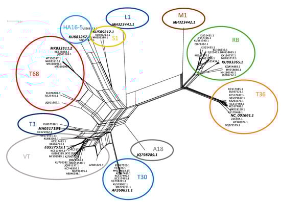 A previous study identified at least seven separate CTV genotype groups (RB, T3, T68, T30, VT, HA16-5, and T36) and the single accession JQ798289.1 (A18) [44]. In the present study, a representative of each of these genotype groups and JQ798289.1 (A18), KU589212.1 (S1), MH323441.1 (L1), and MH323442.1 (M1) was selected to represent the diversity within the CTV species (Figure 1).