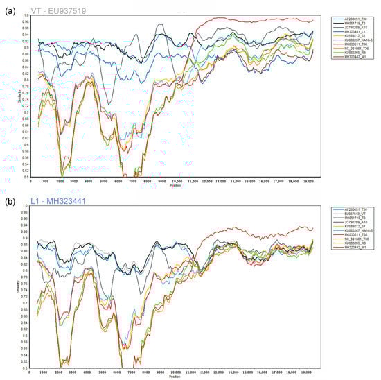 The complete genome of a single citrus tristeza virus (CTV) genotype sequence was compared to a representative sequence of each of the other 10 genotypes at the nucleotide level in a similarity plot. Similarity plots were constructed from a multiple alignment of the eleven genotypes using a window size of 1000 nucleotides (nt) and a step size of 100 nt. (a) Genotype sequence VT (EU937519) was selected as the query sequence; (b) Genotype sequence L1 (MH323441) was selected as the query sequence.