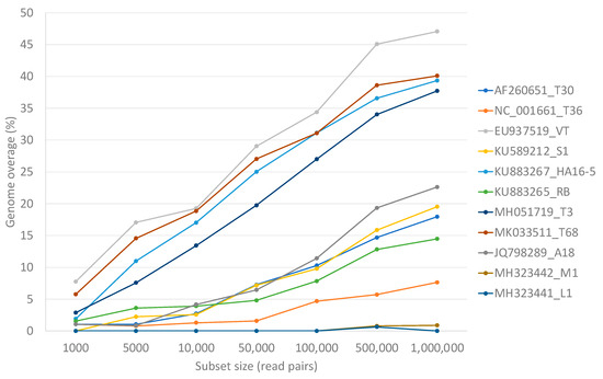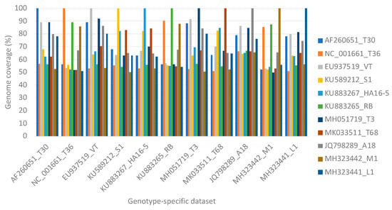 Mixed genotype infections of equal concentration of 10 of the 11 genotypes resulted in higher numbers of non-target read mappings, and as a result, higher genome coverage for genotypes VT (47.1%), T68 (40.1%), HA16-5 (39.3%), and T3 (37.7%) irrespective of data set size compared to the single variant infection mappings (Figure 5).
