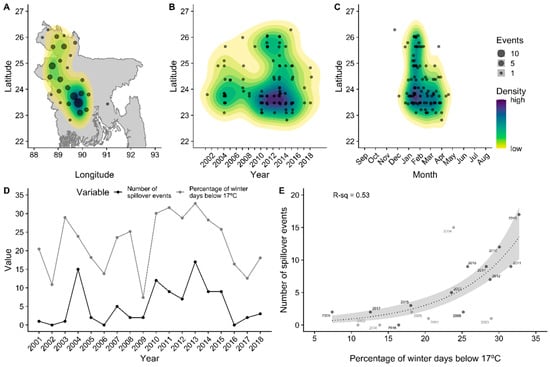 Spatiotemporal patterns of Nipah virus spillover events across Bangladesh, 2001–2018. Color contours in panels (A–C) show the spatial density of events estimated with a bivariate normal kernel. Panels (D,E) show the variation in the number of Nipah spillover events across years and the association with cold winter temperatures. Gray dots in panel (E) show the years before systematic Nipah virus surveillance.