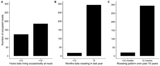 Interviewers mapped a total of 474 roost sites in and around 204 villages, 315 that were occupied at the time of the interview and 159 that were unoccupied. According to interviewees, most occupied roosts (186, 59%) were reported as being at least occasionally occupied for more than 10 years, with an average occupancy duration of 8.5 years (Figure 2A). The majority (294, 93%) of roosts were reported to be continuously occupied every month within the last year, with an average duration of 11.6 months (Figure 2B). This pattern of continuous occupancy was reported by interviewees to have been similar over the last 10 years (Figure 2C). Interviewees generally could not recall what season bats began roosting at sites; however, when reported, roosts were first occupied more frequently in winter than other seasons (Figure S6A, Supplementary Materials). When considering intermittently occupied roost sites (<12 months of occupancy in a year), bats were also more likely to be present at roost sites during winter (Figure S6B, Supplementary Materials).
