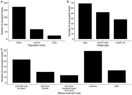 (A) Reported trends for Pteropus medius populations at occupied roost sites. (B) distribution of unoccupied roost sites across Nipah virus case villages and control villages. (C) reported reasons for bats no longer occupying roost sites.