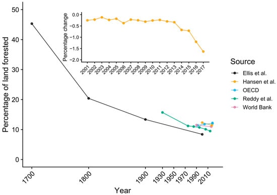 Historical change in forested land area in Bangladesh according to available sources. Inset displays the rate of dense forest loss (annual percentage change) since 2000, with a recent increase in this rate of decline, drawn from Hansen et al. [86]. A cutoff value of 40% was used to define dense forests. Only gross forest loss is displayed, since data on forest gain only cover the period 2000–2012.