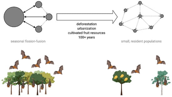 Long-term shifts in pteropodid bat populations and seasonal movements due to anthropogenic land-use change. Black arrows show seasonal movements of bats into large aggregations. Dashed gray arrows represent occasional bat movement between roost sites.