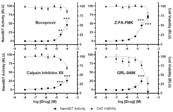 3.5. Four Additional Compounds Inhibit SARS-CoV-2 3CLpro in a Cell-Based Luciferase Complementation Assay: Boceprevir, Z-FA-FMK, Calpain Inhibitor XII, and GRL-0496