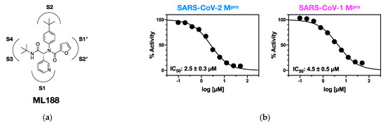 (a) Chemical structure of ML188. (b) Dose-response curves and IC50 values of compound ML188 against SARS2-MPro and SARS1-MPro.