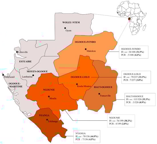 For each province, the data provided indicate the number of HHV-8 positive individuals among the number of individuals tested and obtained by serological (IFA at the 1:160 dilution) and molecular technique (PCR) and the resulting seroprevalence and percentage of positive PCR, respectively. This map was modified from https://commons.wikimedia.org/wiki/Atlas_of_Gabon using Inkscape 0.92.2.