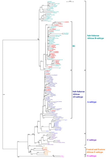 Phylogenetic analysis of the 31 new Kaposi’s sarcoma-associated herpesvirus (KSHV)/HHV-8 sequences. Phylogenetic comparisons were performed with the 689 nucleotide long K1 gene fragment obtained from 153 KSHV/HHV-8 isolates, including the 31 sequences generated in this study (in red) and 122 previously published sequences. The phylogeny was derived by the maximum likelihood (ML) method with the GTR model. Horizontal branch lengths are drawn to scale, with the bar indicating 0.02 nucleotide replacements per site. The maximum posterior probabilities were calculated and reported on the branches with threshold value ≥0.75. * Two strains characterized from South Africa (KS55 and KS137) are not yet molecularly classified [34].
