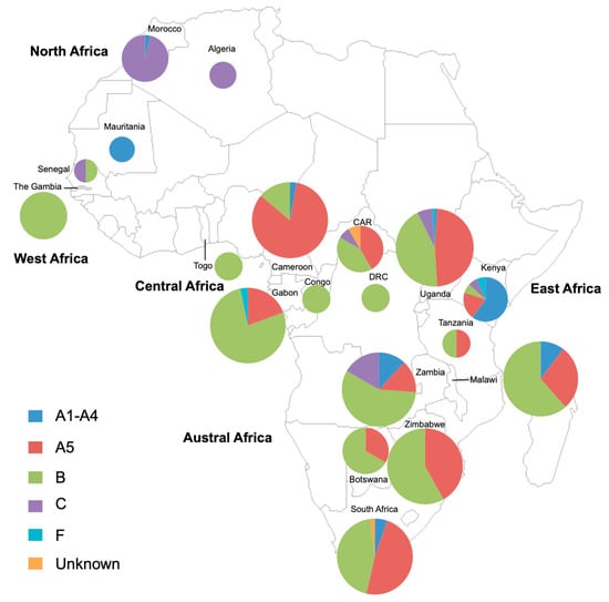Figure 3 shows the distribution of HHV-8 genotypes in 19 African countries based on K1 gene analysis and including the analysis of 483 viral strains: 13 strains from North Africa (Algeria/Mauritania/Morocco), 12 strains from West Africa (Senegal/The Gambia/Togo), 80 strains from Central Africa (Cameroon/Central African Republic (CAR)/Congo/Democratic Republic of Congo (DRC)/Gabon), 113 strains from East Africa (Kenya/Tanzania/Uganda) and 248 strains from Austral Africa (Botswana/Malawi/South Africa/Zambia/Zimbabwe). Countries without any indication have not yet published data on HHV-8 genotypes to our knowledge. The size of the circles is proportional to the number of HHV-8 strains characterized: The smallest size is for less than 5 strains; the intermediate size is for 6 to 30 strains and the largest size is for a number of strains greater than or equal to 31.