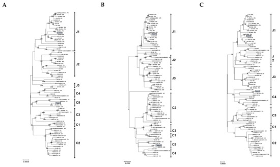 SFTS was identified for the first time in 2011; therefore, the genotyping has not been established yet in the world. Yoshikawa et al. classified SFTSV into eight genotypes: Chinese clades 1 to 5 (C1 to C5 clades) and Japanese clades 1 to 3 (J1 to J3 clades) [9]. These previous studies revealed that the distribution of SFTSV genotypes has regional characteristics. J1–J3 clades were mainly detected in Japan and Korea, whereas C1–C5 clades were found in China [9,10]. In Korea, it is estimated that 70% of the SFTSV belong to the J clade; in addition, recently, the C clade has also been identified there [9,11]. The C clade has been detected in Japan, but there are fewer reports than in Korea [9]. There are only few whole genome analyses limited to classifying genotypes. Some previous studies analyzed only a partial region or only the M or S segments; therefore, there are few complete SFTSV sequences in the public database. SFTSV showed different genotypes in each segment, indicating that SFTSV undergoes reassortment like the influenza virus and the rotavirus for genome segments [10,12].