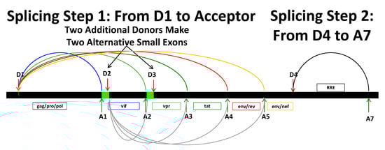 - Bohne, J.; Wodrich, H.; Krausslich, H.G. Splicing of human immunodeficiency virus RNA is position-dependent suggesting sequential removal of introns from the 5′ end. Nucleic Acids Res. 2005, 33, 825–837. [Google Scholar] [CrossRef]