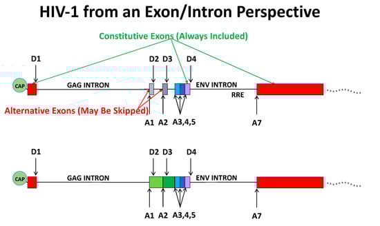 - Purcell, D.F.; Martin, M.A. Alternative splicing of human immunodeficiency virus type 1 mRNA modulates viral protein expression, replication, and infectivity. J. Virol. 1993, 67, 6365–6378. [Google Scholar] [CrossRef] [PubMed]