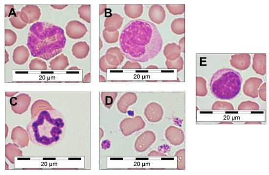 Microscopic morphology of M. natalensis blood cells. Eosinophil (A), monocyte (B), neutrophil (C), activated platelets (D) and lymphocyte (E). Quick-Diff staining, magnification 100× (oil immersion). Microscopic photographs were digitally sharpened and saturation increased by 8% and a scale bar was overlaid.