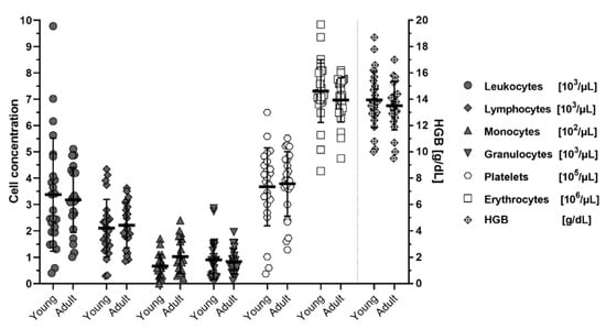 Cell concentrations in blood of M. natalensis with age. Young (<6 months; 8–17 weeks) and adult (>6 months; 24–56 weeks old) animals show no significant differences in blood cell counts or hemoglobin concentrations (HGB). Data shown as biological replicates (symbol), mean (bar) ± SD.