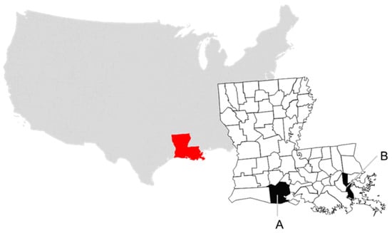 Collection sites in Louisiana, USA at parish level and by sampling year for this study: (A) Vermilion, 2018, and (B) Jefferson, 2019.