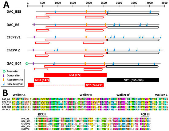 Through genome walking [20] we managed to obtain the near complete genomic sequence of six viruses, including five DAC strains and a virus identified in a gull. These sequences encompassed the full NS1 and VP1 coding regions while lacking the terminal non-coding portions. By comparing the genomes of viruses closely related to DACs (see below), a similar genome organization could be observed. Specifically, besides the two main open reading frames (ORFs) corresponding to the SF3-domain containing replication initiator protein NS1 and the structural proteins of the capsid, VPs, two additional ORFs overlapping the NS1 ORF were detected. These have been previously reported for chaphamaparvoviruses and they could encode ancillary nonstructural proteins [16,40] (Figure 1A). Finally, the conserved Walker and rolling circle replication (RCR) motifs typical of parvoviral helicases could be distinguished within the deduced NS1 protein sequences (Figure 1B). Chaphamaparvoviruses lack a PLA2 domain in VP1.