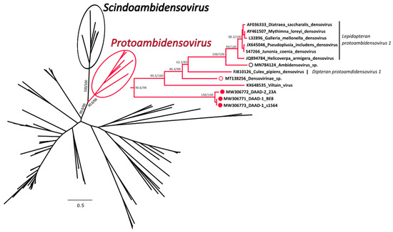 A phylogenetic tree was built with an alignment of 117 NS1 amino acid sequences from viruses in the subfamily Densovirinae and in this tree DAADs were included in a highly supported clade that also included members of the genus Protoambidensovirus (Figure 4 and Supplementary Figure S3 for the tree in extenso). This formed another highly supported clade with members of the genus Scindoambidensovirus, its closest related group of viruses. Within the protoambidensoviruses, sequences found during metagenomic analyses of samples from birds (indicated by an empty red circle) and a drill monkey living in a wildlife sanctuary in Nigeria [43] (empty black circle) were also included and DAADs (full red circles) were the closest to the root of the clade.
