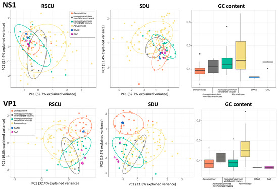 Compositional analyses of viruses within the Parvoviridae. Principal component analysis (PCA) plots based on relative synonymous codon usage (RSCU) and synonymous dinucleotide usage (SDU) values are shown on the left and in the center, respectively; ellipses are drawn around groups as indicated in the legend with a normal probability size of 70% and axes represent dimensions explaining the largest variances. Box-and-whisker plots based on GC contents in each group are showed on the right; upper and lower whiskers indicate the highest and lowest values within 1.5 times the interquartile range, while boxes indicate the interquartile range itself with average values displayed as thick lines. Dots indicate potential outliers.