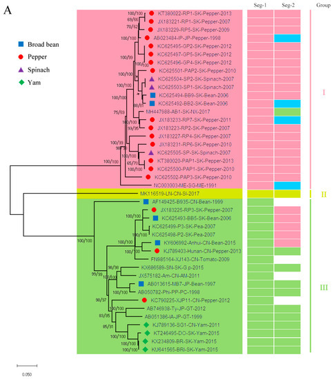 The evolutionary analysis and genetic variation of BBWV-2 from broad bean or pepper have been described based on analyses of partial or complete genome sequences [2,25]. In this study, our results provide significant insight into the evolutionary patterns of BBWV-2. For segmented viruses, rapid genomic changes were driven by both recombination and reassortment [58,59]. Previously, recombination was proven to be the factors shaping the evolution of BBWV-2 [2]. Here, our current findings suggest that genetic exchange by reassortment also had a significant influence on the genomic composition of BBWV-2.