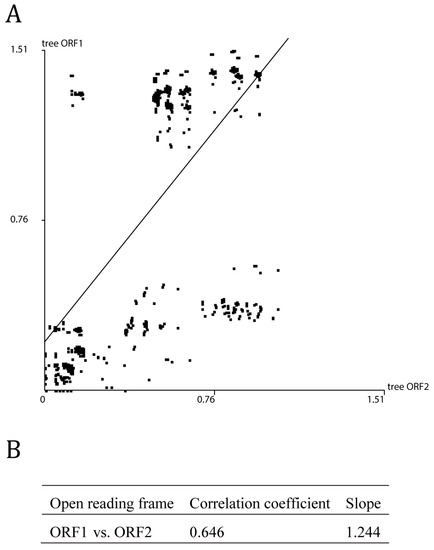 Graphs comparing patristic distances in pairs of maximum-likelihood trees based on the ORF1 and ORF2 sequences of nonrecombinant broad bean wilt virus 2. (A) Graphs comparing patristic distances; (B) correlation coefficient of ORF1 and ORF2.