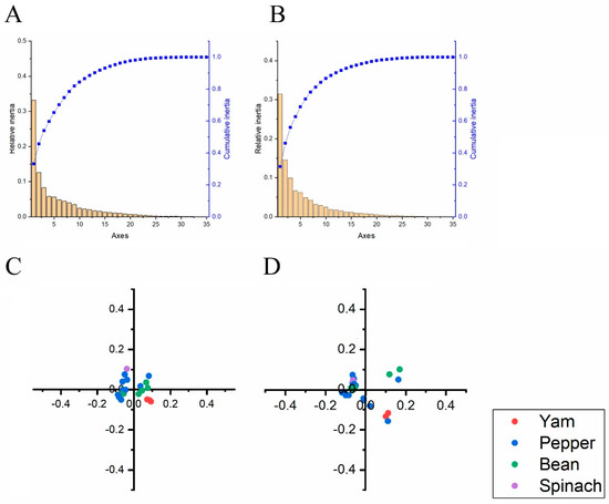 The relative and cumulative inertia of the 35 axes from a COA of the RSCU values based on the ORF1 (A) and ORF2 (B) sequences of broad bean wilt virus 2. PCA based on the RSCU values of the ORF1 (C) and ORF2 (D) sequences of broad bean wilt virus 2. The broad bean pepper, spinach and yam hosts are showed in green, blue, purple and red dots, respectively.