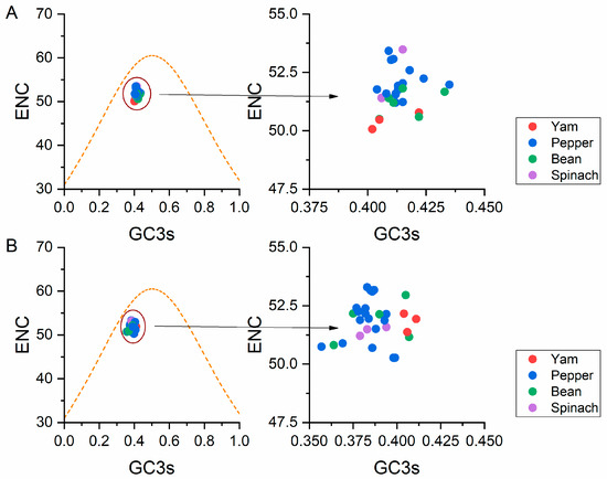 ENC values ranging from 20 (only one synonymous codon is used, an extreme codon usage bias) to 61 (the synonymous codons are used equally, no bias), indicating the degree of codon usage bias [53], were calculated by CodonW v1.4.2 software. ENC values were estimated as follows: