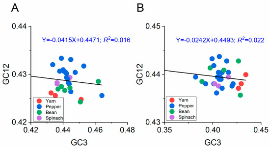 Neutrality plot analysis of GC3 against GC12 for the ORF1 (A) and ORF2 (B) sequences of broad bean wilt virus 2. The broad bean, pepper, spinach and yam hosts are represented in green, blue, purple and red dots, respectively.