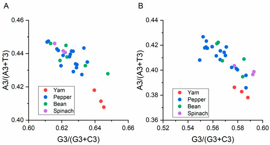 Parity plot showing the presence of AT bias [A3%/(A3% + T3%)] and GC bias [G3%/(G3% + C3%)] for the ORF1 (A) and ORF2 (B) sequences of broad bean wilt virus 2. The center of the plot, where the value of both coordinates is 0.5, indicates the place where there is no bias in mutation or selection rates. The broad bean pepper, spinach and yam hosts are represented in green, blue, purple and red dots, respectively.
