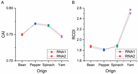 The CAI analysis and RCDI analysis of the ORF1 (A) and ORF2 (B) sequences of broad bean wilt virus 2 in relation to the natural hosts. The x-axis represents the sequences identified in different hosts.