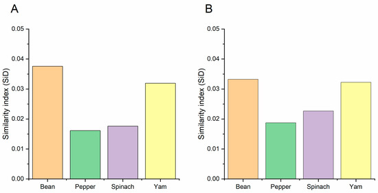 The SiD analysis of the ORF1 (A) and ORF2 (B) sequences of broad bean wilt virus 2 in relation to the natural hosts. The broad bean pepper, spinach and yam hosts are showed in light orange, green, purple and yellow column, respectively. The x-axis represents the sequences identified in different hosts.