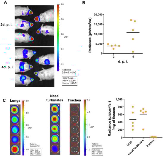 Generation of recombinant human RSV expressing Luciferase (rHRSV-Luc) has been instrumental in following RSV infection processes (spreading and replication) in whole living mice using bioluminescent intravital imaging [48]. Replication of rHRSV-Luc in vivo in Balb/c mice was quantified by luminescence in the whole mouse body during the first 2 days post-infection (d.p.i.). The RSV signal was initially detected mainly in the nasal cavity (Figure 1A), before spreading to the lower respiratory tract, reaching a peak of virus replication in the lungs at 4 d.p.i. (Figure 1B), as previously published [48]. To overcome the potential limits of detection of photons scattered through thick tissues, we analyzed bioluminescence signals of rHRSV-Luc in specific tissues of the upper and lower airways, i.e., nasal turbinates, the trachea and the lungs. Quantification of Luciferase activity in tissue lysates showed that at 4 d.p.i., rHRSV-Luc is detected in the nasal turbinates and in the lungs but not in the trachea (Figure 1C). These results can be related to the dose of the virus administered by intranasal instillation and do not exclude the ability of RSV to infect tracheal cells in other conditions. Notably, it was previously shown that viral replication estimated in vivo by quantifying bioluminescence signals directly correlated with virus load [48].