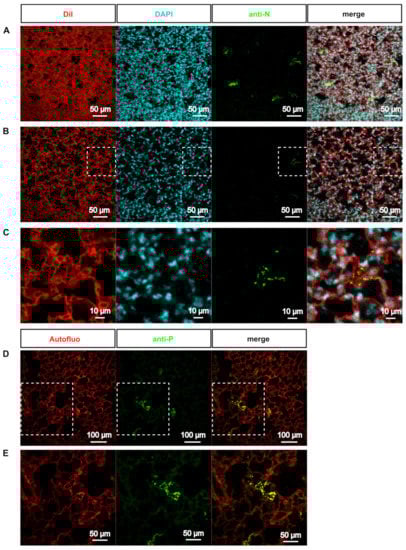 We next assessed the detection of the cytoplasmic IBs using our approach. These viral factories [21] contained all the constituents of the RSV polymerase complex, composed of four proteins (i.e., the RNA-dependent RNA polymerase L, its cofactor P, the ribonucleocapside composed of viral genome encapsidated by the N protein, and the transcription factor M2-1) [4]. IBs cannot be detected in biopsies when immunolabeled with anti-mCherry (Figure 3A–D), because in the rHRSV-mCherry, mCherry is expressed as an additional protein (i.e., not fused to a viral protein) with a cytosolic expression pattern [48]. We thus performed immunostaining of lung biopsies with anti-N antibodies together with counterstaining of nuclei with DAPI and cell membrane and cytoplasm with DiI (Figure 4A–C). Deep-imaging revealed the presence of N-positive fluorescent inclusions scattered throughout the lung parenchyma (Figure 4A–C). Higher magnification of positive signals confirmed the presence of cytosolic fluorescent puncta in type I pneumocytes (Figure 4C). Notably, similar results were obtained when labeling the P protein (Figure 4D,E). These observations strongly suggest that cytosolic puncta could correspond to RSV IBs, although a co-staining by both anti-N and anti-P antibodies is needed to confirm this hypothesis [20,21]. These last observations show that 3D imaging of transparent lung biopsies is likely to constitute a valuable tool for the assessment of RSV infection at a subcellular level.