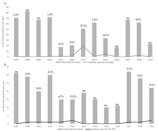 Annual distribution of the total number of patients tested between 2007 and 2019 (grey boxes). The number of positive cases diagnosed during each year is indicated by grey lines. The number of positive cases for serology and for RT-PCR is given in (A,B), respectively. Percentages of positive cases per each year are given in each graph.
