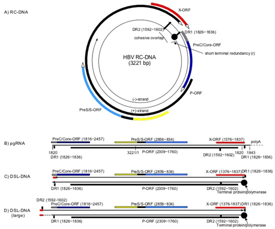 Human hepatitis B virus (HBV) DNA replication intermediates and integration into the chromosomal DNA of hepatocytes: Viral RC-DNA, shown at the top (A), is converted to covalently closed circular DNA (CCC-DNA) (not shown) during initiation of infection. All of the virus open reading frames (ORFs) are encoded on the negative strand of the RC-DNA genome as shown and include the polymerase (P-ORF), PreC/Core (C-ORF), PreS/S-ORF and X-ORF. Pre-genomic RNA (pgRNA) (B) is transcribed from CCC-DNA and functions as the mRNA for core (nucleocapsid) and polymerase (reverse transcriptase) proteins, both of which are required for viral DNA synthesis. Core protein is also recognized in infected cells as hepatitis B core antigen (HBcAg). An mRNA with extra 5′ sequences is the template for the PreC/Core protein that is processed into the secreted hepatitis B e antigen (HBeAg), while sub-genomic mRNAs encode the HBV envelope proteins (HBsAg) and the HBV X protein (HBx). Pre-genomic RNA along with the viral polymerase is packaged in the cytoplasm into viral nucleocapsids comprised of core protein and is reverse transcribed into new viral DNA. RC-DNA (A) is the major product of reverse transcription. As discussed in the text, DSL-DNA (C) is a minor species formed when the RNA primer for second strand synthesis fails to translocate from DR1 to DR2. DSL-DNA is the usual precursor for HBV DNA integration into chromosomal DNA. A second larger form of DSL-DNA (D) is proposed to be formed from RC-DNA during initiation of infection, via strand displacement DNA synthesis through the cohesive overlap region of RC-DNA. As discussed, this larger DSL-DNA species may also be a precursor for integration of HBV DNA into chromosomal DNA.