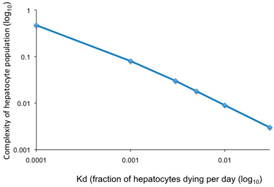 Changes in the complexity of the hepatocyte population after 30 years where all hepatocytes contribute equally to homeostasis (Model 4). Loss of complexity of the hepatocyte population was calculated using the program comp10 [11], assuming the indicated fraction of hepatocytes dying per day (Kd) over a period of 30 years, beginning when the liver reached full size. Declines in complexity are relative to the complexity when the liver first reaches full size. Calculations were made for Kd = 0.0001, 0.001, 0.003, 0.005, 0.01, and 0.03, respectively, as indicated by the diamonds in the plot.