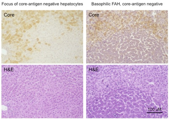 Foci of normal and basophilic, woodchuck hepatitis-virus (WHV) core antigen-negative hepatocytes in chronically WHV-infected woodchuck liver. The left-hand panels are consecutive sections of WHV-infected liver, either immune-peroxidase stained using antibodies to WHV core antigen (top) or Hematoxylin and Eosin (H&E) stained (bottom), showing a focus of histologically normal, WHV core antigen-negative hepatocytes. The right-hand panels are similar consecutive sections showing a basophilic focus of altered hepatocytes (FAH) that are also WHV core antigen-negative. Figure adapted and reproduced with permission from reference [91], Xu et al., Virology, published by Elsevier, 2007.