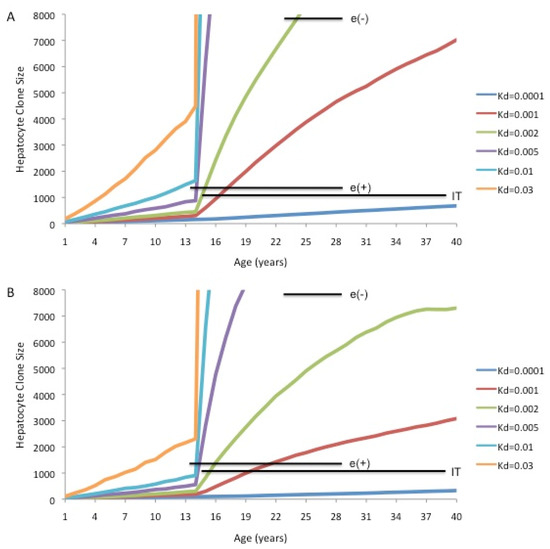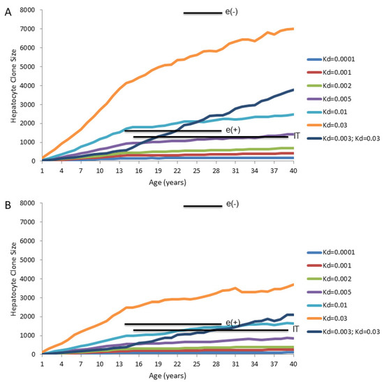 Computer modeling of maximum predicted hepatocyte clone sizes if homeostasis in the adult liver is maintained by TERT-high hepatocytes (Model 3): Maximum hepatocyte clone sizes were calculated for the indicated daily death rates (e.g., 0.2% per day, Kd = 0.002) using the Fortran program ncsize8hp (available upon request to Samuel.litwin@fccc.edu). TERT-high hepatocytes were assumed to represent 3% of the hepatocyte population throughout. During the growth phase of the liver, the TERT-high hepatocytes were assumed to be a self-contained population that did not differentially contribute to liver homeostasis. Once the liver reached full size, they were assumed to have a seven-fold growth advantage over TERT-low hepatocytes, giving rise to both TERT-high and TERT-low hepatocytes [68]. Both TERT-high and TERT-low hepatocytes were assumed to die at the indicated daily rates. The horizontal bars show the geometric mean of maximum hepatocyte clone sizes observed using inverse-nested PCR assays for integrated HBV DNA in a study of three different groups of patients with chronic infection: immune tolerant (IT), immune active HBeAg-positive (e(+)), and immune active HBeAg-negative (e(-)) [75]. The bars span the ages covered by each group of patients. (A) Maximum clone size predictions assuming 100% of hepatocytes had lineage-specific markers at birth. (B) Maximum clone size predictions assuming only 1.0% of hepatocytes had detectable lineage-specific markers (e.g., randomly integrated HBV DNA) at birth.